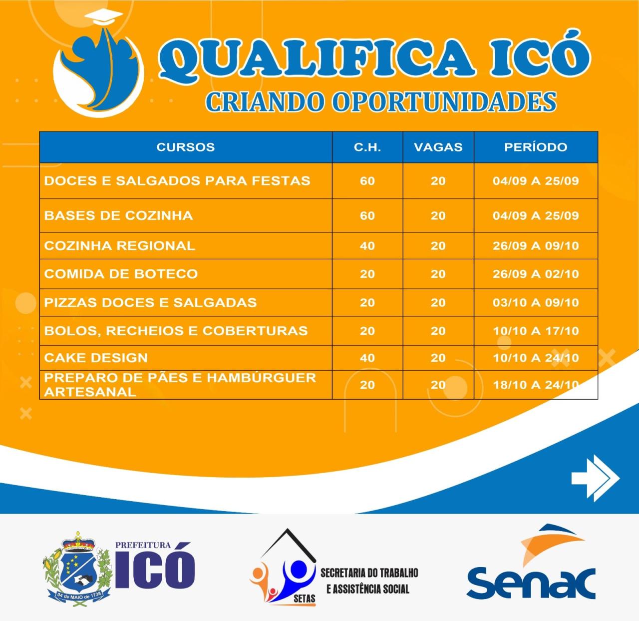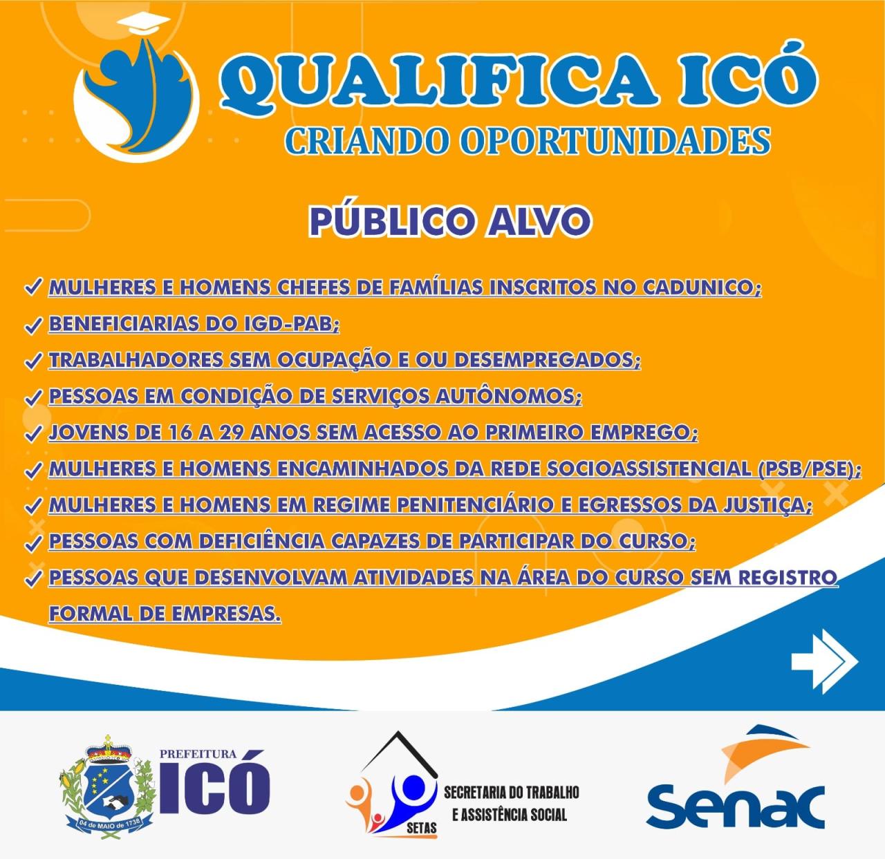 A Prefeitura Municipal de Icó, através da Secretaria do Trabalho e Assistência Social, deu início nesta terça-feira (01/08) às inscrições para a 4° Edição do Qualifica Icó - Criando Oportunidades.