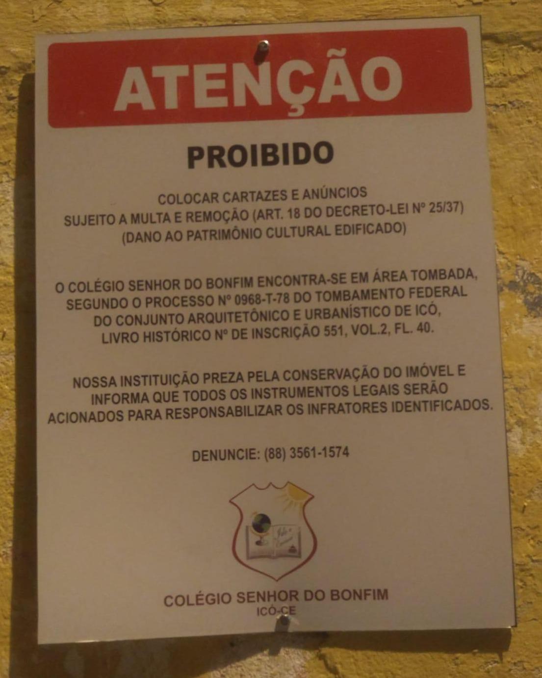 Ao todo, 6 cartazes de anúncios de uma instituição de ensino foram colocados irregularmente em parte do muro do prédio do colégio Senhor do Bonfim em Icó.