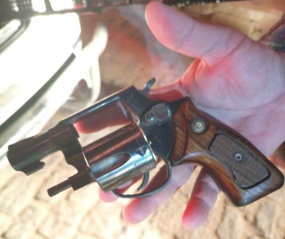 Com o suspeito que estava em fuga do local do crime, os Militares encontraram um revólver Taurus calibre 38, cabo de madeira, com cinco cápsulas deflagradas, arma utilizada no homicídio.