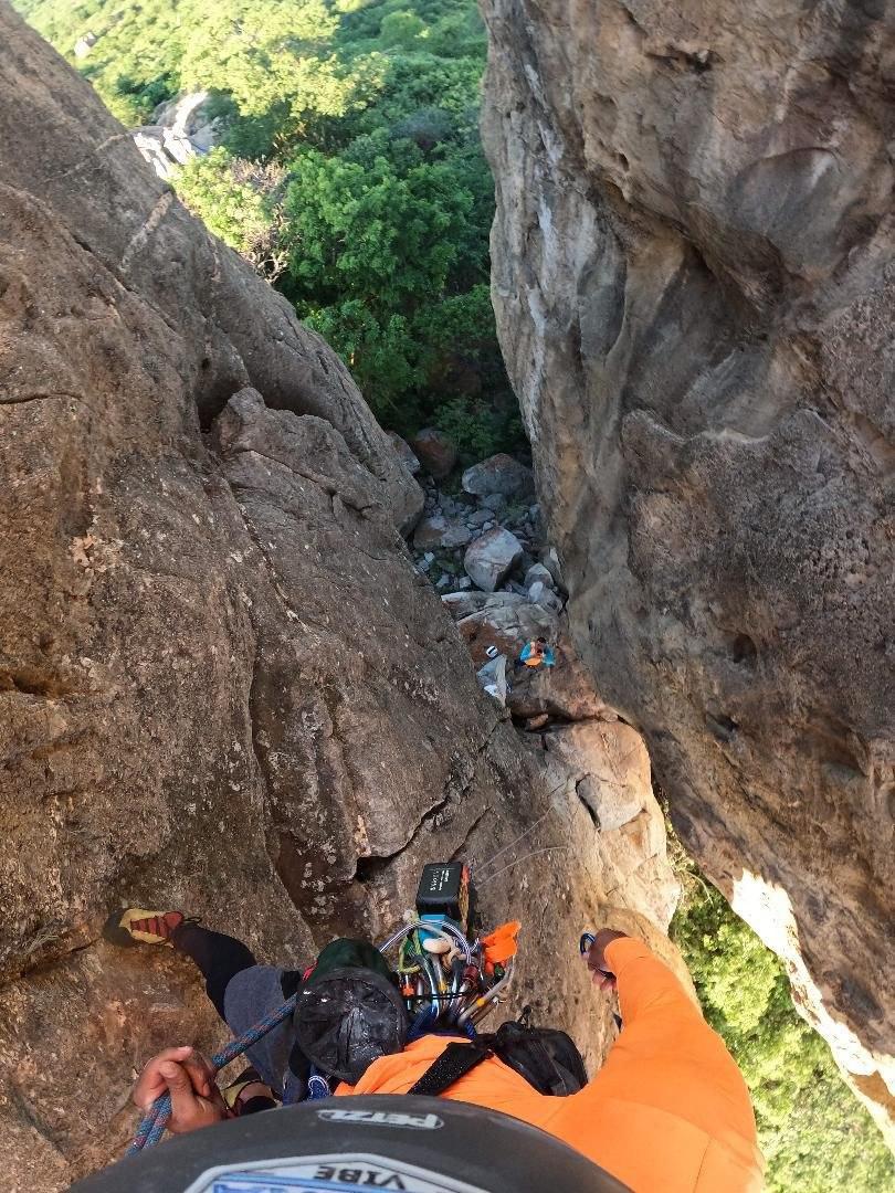 Durante a subida, Carlos contou com o apoio fundamental de Mário Victor, responsável pela segurança na base. Esse procedimento, conhecido como “segurança de baixo”, consiste no controle da corda enquanto o escalador instala as proteções na rocha e avança na subida, garantindo que, em caso de queda, o impacto não seja até o solo.![]()