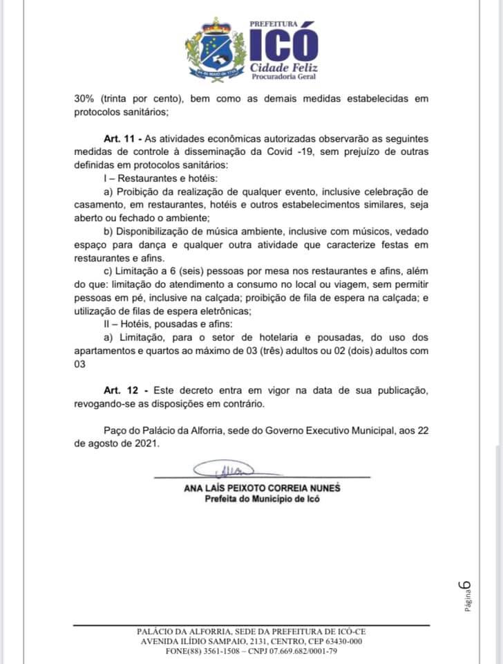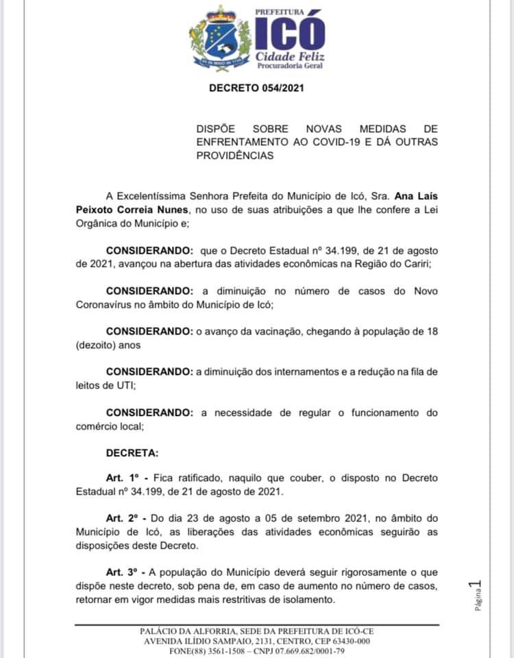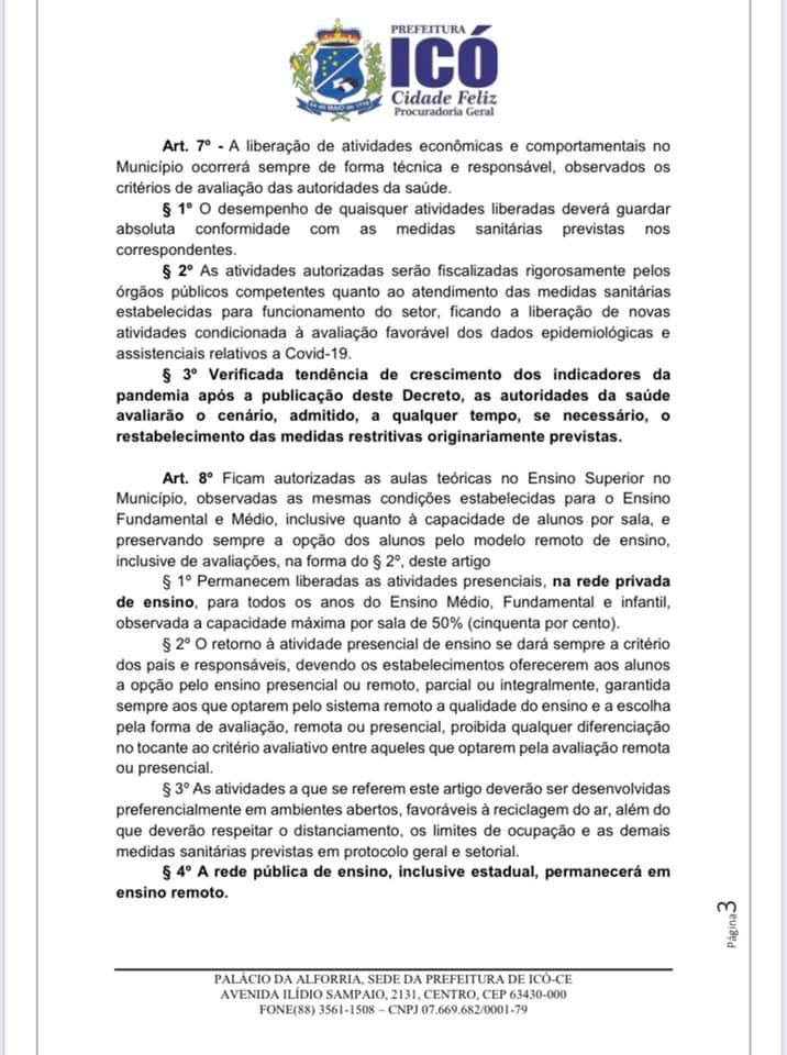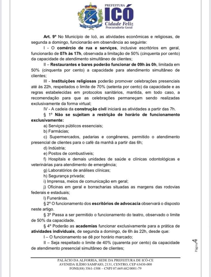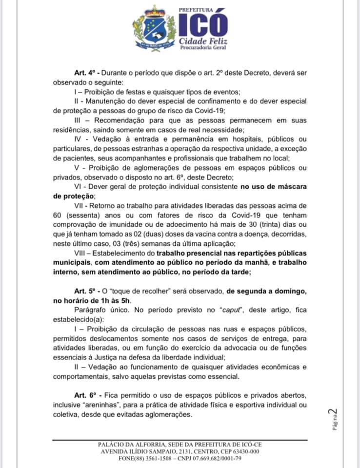 Confira novo decreto do municipio de Icó divulgado na noite de hoje (23), atualizando medidas de enfretamento a Covid-19.