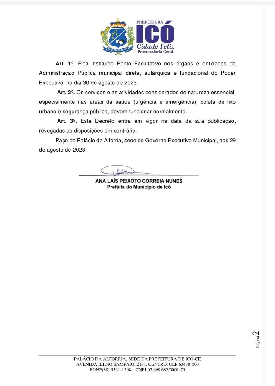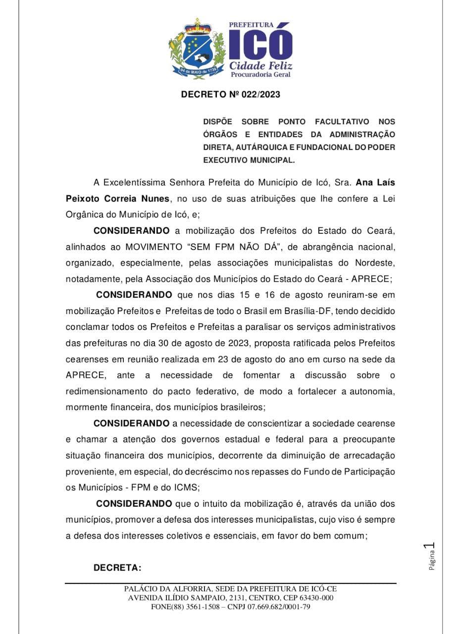 A Prefeitura de Icó anunciou hoje, terça-feira 29 de agosto, a decretação de um Ponto Facultativo em todos os Órgãos da Administração Pública. A medida, conforme o documento oficial, está em consonância com a mobilização dos Prefeitos do Estado do Ceará, que aderiram ao Movimento "Sem FPM Não Dá", uma iniciativa de alcance nacional.