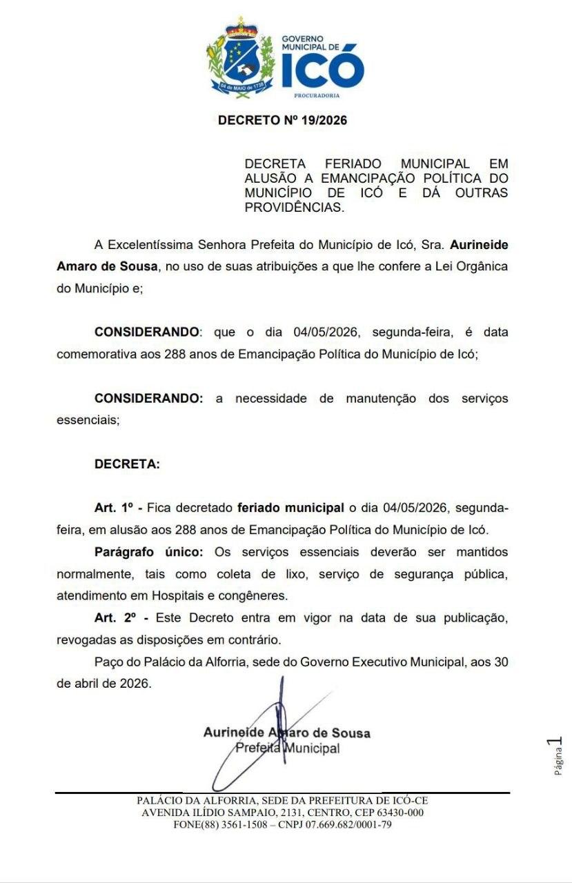 A Prefeitura de Icó publicou o Decreto nº 19/2026, estabelecendo feriado municipal no dia 4 de maio, em comemoração aos 288 anos de emancipação política do município.
