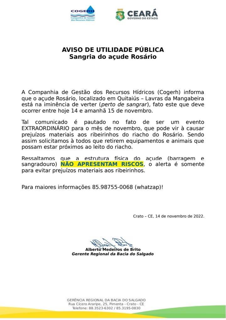A publicação informa ainda que o açude Rosário, que abastece o rio Quitaiús, deverá sangrar entre segunda-feira e terça-feira (14 e 15). A cheia do reservatório no mês de novembro é um "evento extraordinário", conforme o órgão estadual.