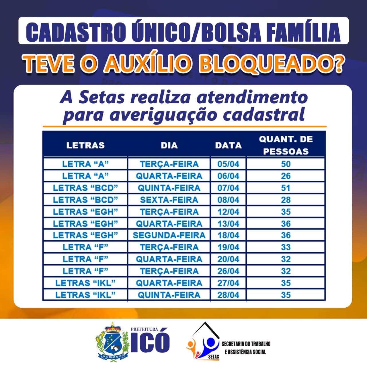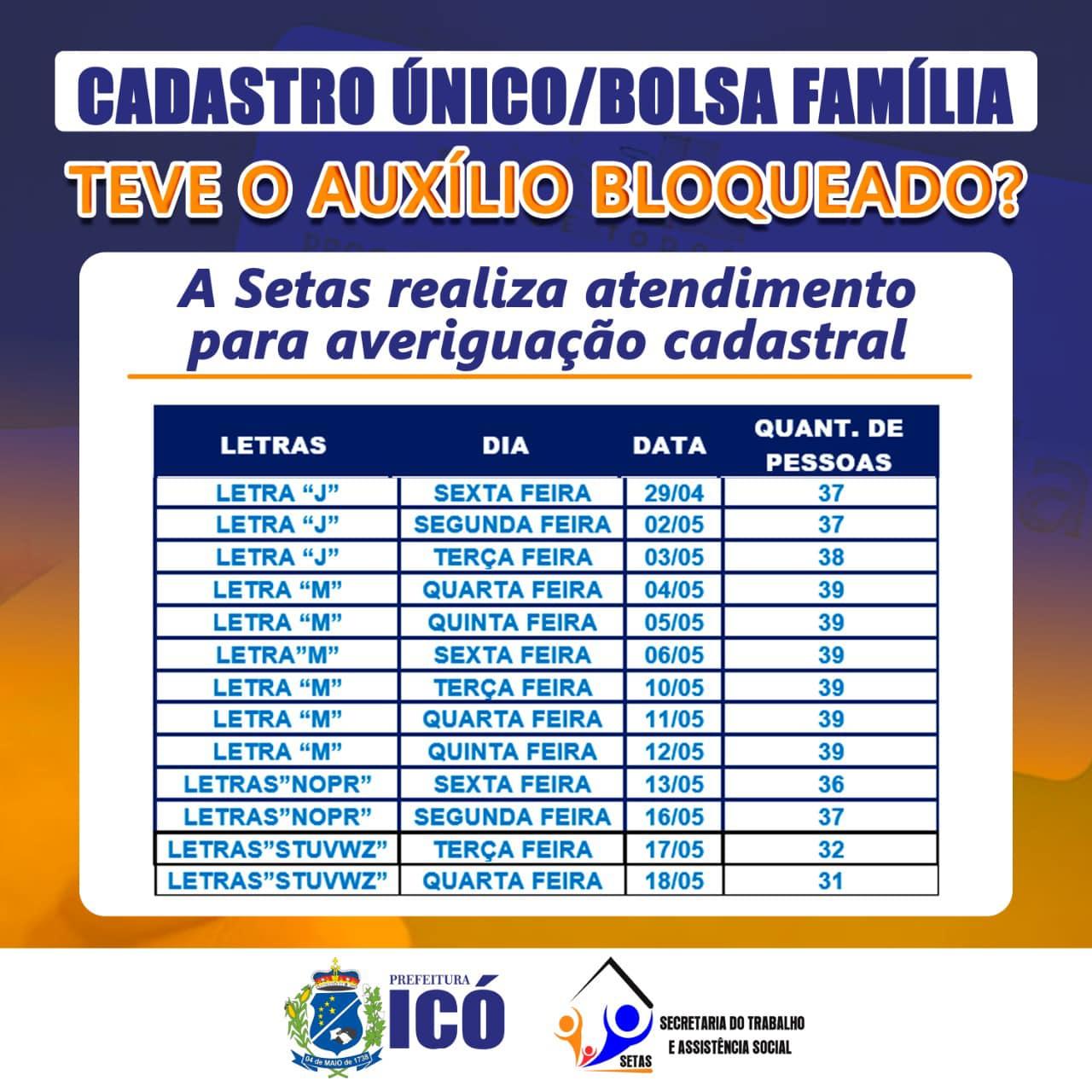 A Secretaria do Trabalho e Assistência Social de Icó divulga relação nominal de pessoas que se encontram em situação de averiguação ou revisão cadastral referente ao Cadastro Único/Auxílio Brasil (Bolsa Família).